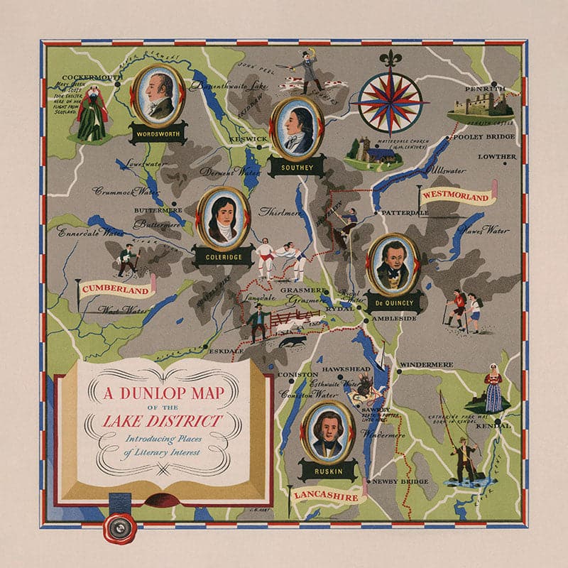 Etwas ungewöhnlich ist diese Karte mit Silhouetten und Porträts berühmter Menschen und Autoren gepunktet - wie Wordsworth und Ruskin, und ein Marker, an dem Mary Queen of Scots 'Schutz in ihrem Flug von Schottland übernommen wurde.