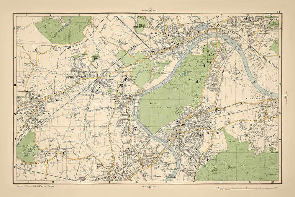 Die detaillierte Darstellung bedeutender Stadtteile wie Isleworth und Richmond bietet einen faszinierenden Einblick in ihre historischen Landschaften. Richmond, bekannt für seine malerische Schönheit, wird neben den üppigen Weiten des Old Deer Park hervorgehoben. Diese Mischung aus städtischen und ländlichen Elementen zeichnet ein lebendiges Bild einer Stadt am Rande der Moderne und ist damit ein Muss für Liebhaber der Stadtgeschichte und Kartografie.