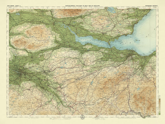 Das Design der Karte ist sowohl funktional als auch ästhetisch ansprechend, mit einem klaren, attraktiven Layout, das die Navigation durch die politischen und physischen Merkmale der Region erleichtert. Basierend auf einer reduzierten Ordnance Survey-Karte aus derselben Zeit bietet sie einen umfassenden Blick auf den Edinburgh District, einschließlich seiner Städte, Gemeinden und natürlichen Wahrzeichen. Die subtile Verwendung von Farben zur Darstellung des Landschaftsreliefs verbessert nicht nur die visuelle Anziehungskraft der Karte, sondern liefert auch wertvolle Informationen über das Terrain, was sie zu einem unverzichtbaren Werkzeug für Reisende und Geografie-Enthusiasten macht.