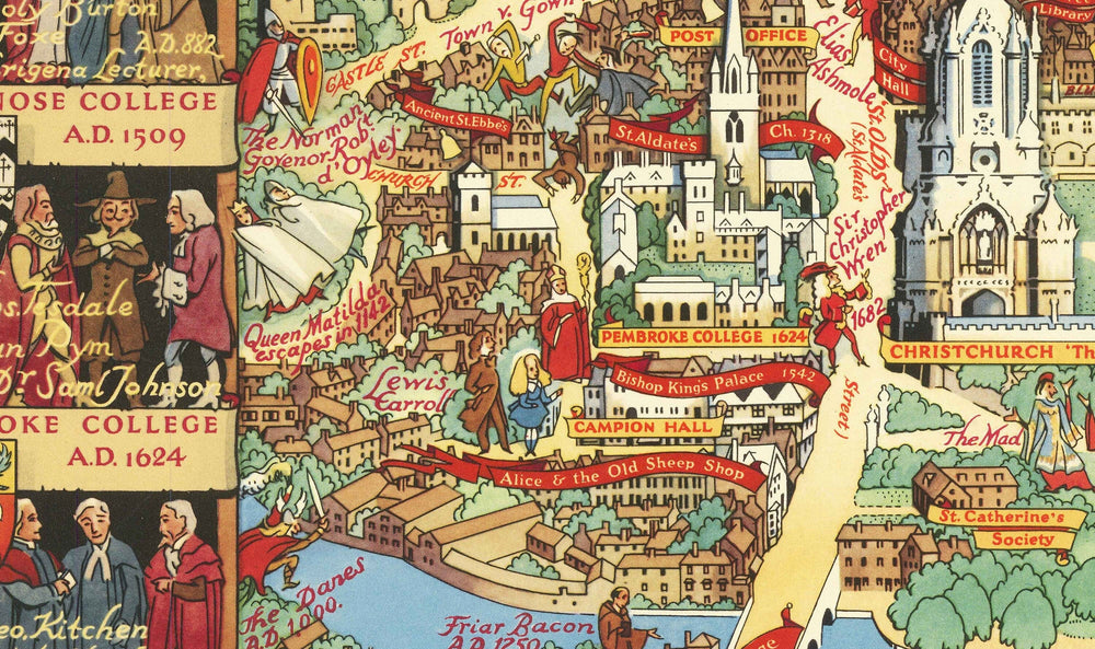 Alte bildliche Karte von Oxford von Kerry Lee, 1948: Bildliche Universitätskollegien, Sehenswürdigkeiten