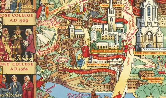 Diese umfassen: Der Glockenturm, St. Peter-in-the-East, die Universität Oxford (Universitas Oxon), St. Catherine's, Keble, All Souls, Trinity, Corpus Christi, Worcester College, Lincoln College, Pembroke College und New College. Es gibt noch viele weitere, die auf der Karte sichtbar sind, einschließlich der Embleme der Colleges und der Universität. Jedes College ist hier abgebildet - außer den neuesten Colleges, die seit 1948 gegründet wurden.