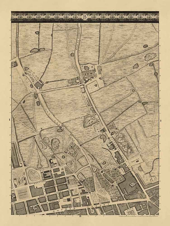 Alte Karte von London von John Rocque, 1746, B1: Oxford Street, Tottenham Court Road, Fitzrovia, Soho & Cavendish Square
