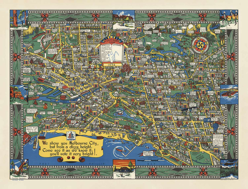 Alte Karte von Melbourne, Victoria von John Power Studios, 1934: Innenstadt, Bahnhof, Parks, Zoo, Strand, Yarra River