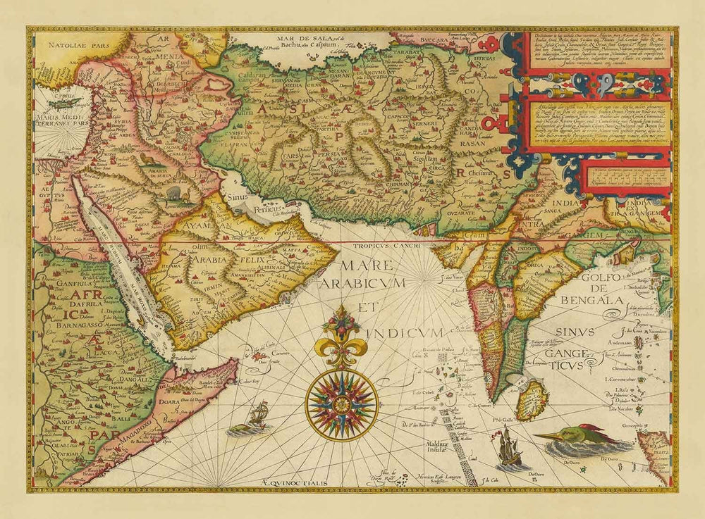 Diese Karte erstreckt sich über eine riesige Region, von Ägypten und Syrien im Westen bis Arabien und Persien in der Mitte und schließlich Indien und Bangladesch im Osten. Heute ist das riesige Gebiet Persiens zwischen Iran, Afghanistan und Pakistan aufgeteilt.