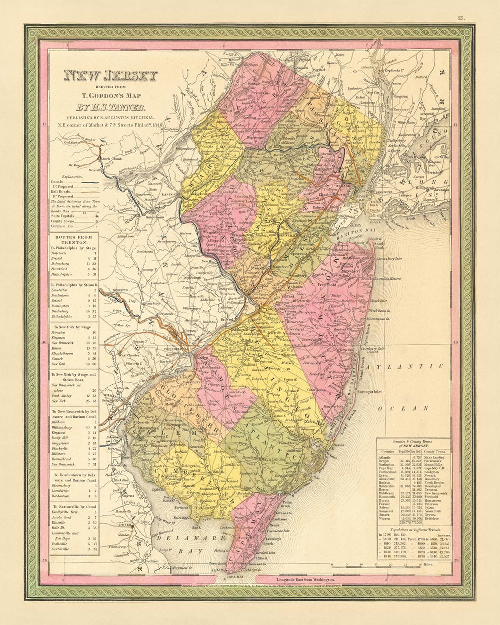 Diese alte Karte von New Jersey, angefertigt von Henry Schenck Tanner aus dem Jahr 1847, bietet einen faszinierenden Einblick in die Geschichte und Geographie des Staates. Die Karte zeigt New Jersey sehr detailliert mit deutlich beschrifteten Großstädten, Ortschaften, Flüssen und Seen.