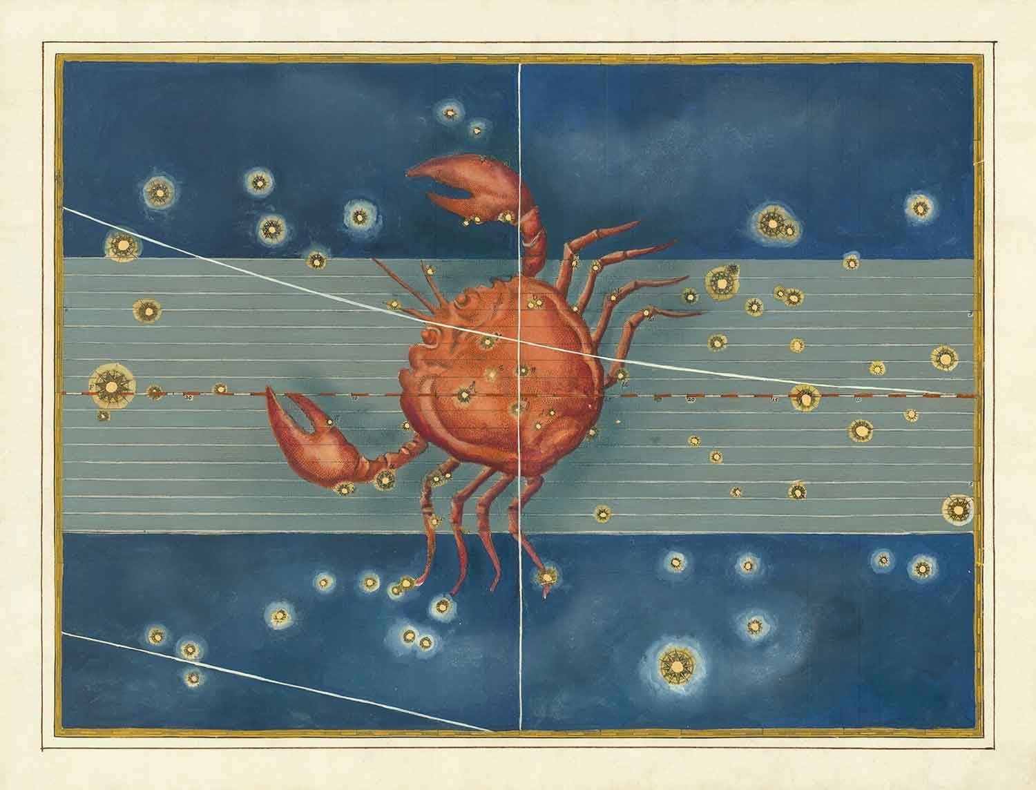 Diese Sternenkarte wurde ursprünglich 1603 in Johann Bayers "Uranometria" veröffentlicht, vielleicht dem einflussreichsten Sternenatlas, der jemals veröffentlicht wurde, und dem Vorläufer aller modernen Sternenatlanten. Sie enthielt 51 hochgenaue Sternkarten, von denen 48 die ptolemäischen Sternbilder waren. Und natürlich waren die 12 Hauptzeichen des Tierkreises, einschließlich dieses schönen Krebses, alle enthalten.