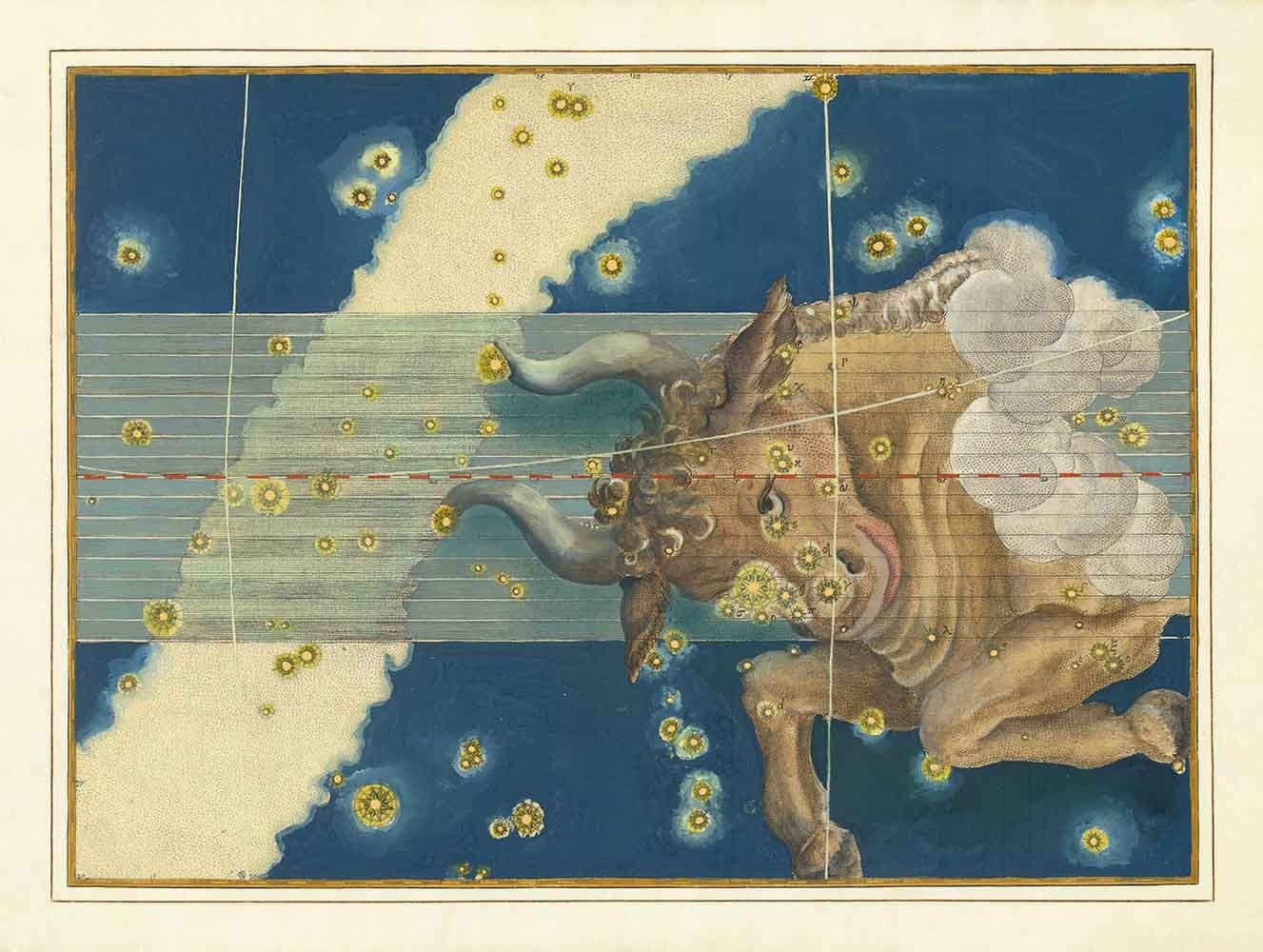 Diese Sternenkarte wurde ursprünglich 1603 in Johann Bayers "Uranometria" veröffentlicht, vielleicht dem einflussreichsten Sternenatlas, der je veröffentlicht wurde, und dem Vorläufer aller modernen Sternenatlanten. Sie enthielt 51 hochgenaue Sternenkarten, von denen 48 die ptolemäischen Sternbilder waren. Und natürlich waren die 12 Hauptzeichen des Tierkreises, einschließlich dieses schönen Stiers, alle enthalten.