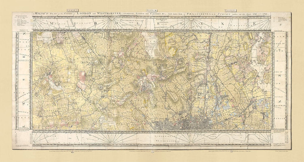 Seltene alte Karte von London und den Vororten, 1799 von Milne: Stadt, Hackney, Westminster, Dalston, Hampstead, Felder