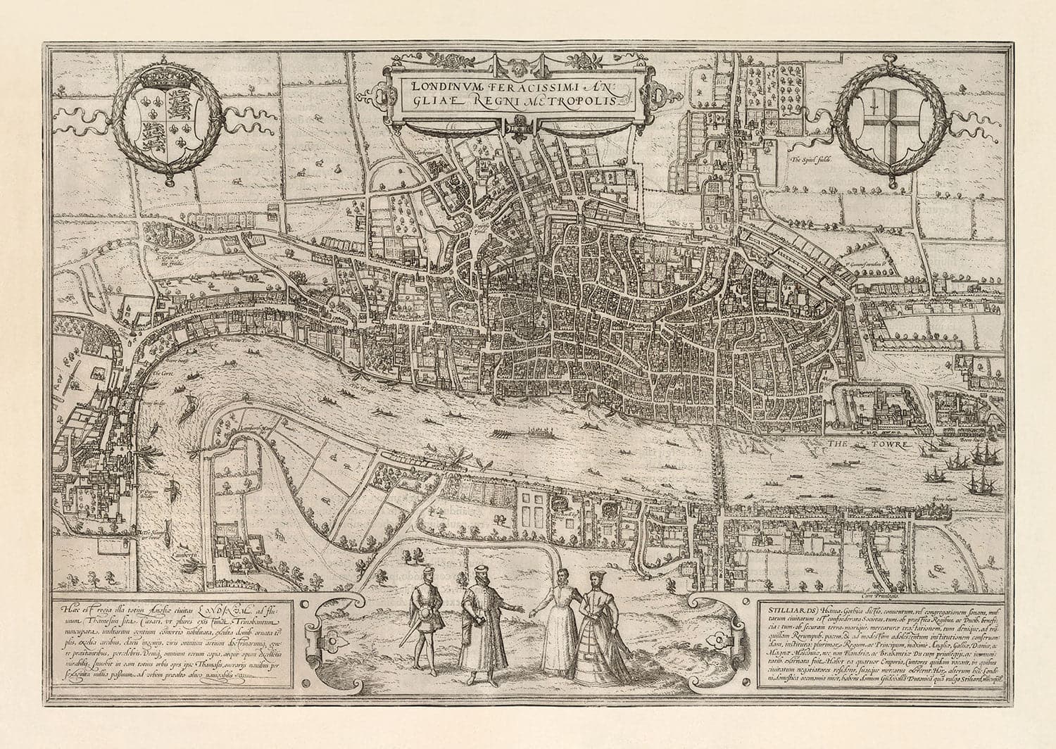 Viele von Londons Wahrzeichen sind bereits auf dieser Karte sichtbar, obwohl die meisten von ihnen ganz anders geschrieben sind! Zum Beispiel gibt es Allgate - oder Aldgate, wie es heute bekannt ist. Moor Gate - Moorgate. Die Spitel Fields - Spitalfields. Howlburne... Holborn! Charyncros... Charring Cross!