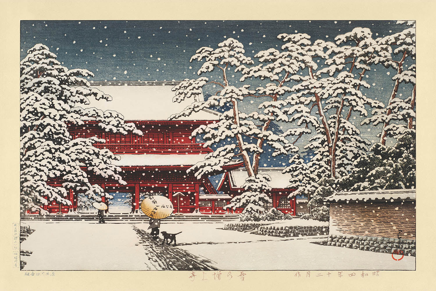 Die zurückhaltende Farbpalette der Komposition – dominiert von schneebedeckten Weißtönen, reichen Rottönen der Tempelstruktur und ruhigen blauen Schatten – schafft sowohl visuelle Harmonie als auch subtile Dramatik. Dieses harmonische Gleichgewicht, zusammen mit Kawases geschicktem Umgang mit Transluzenz und Textur, ergibt einen Druck, der sowohl elegant als auch tiefgründig ist; eine perfekte Wahl für Sammler japanischer Kunst, für alle, die ruhige Landschaften lieben, oder für diejenigen, die ruhige Inspiration für ihren Wohnraum suchen.