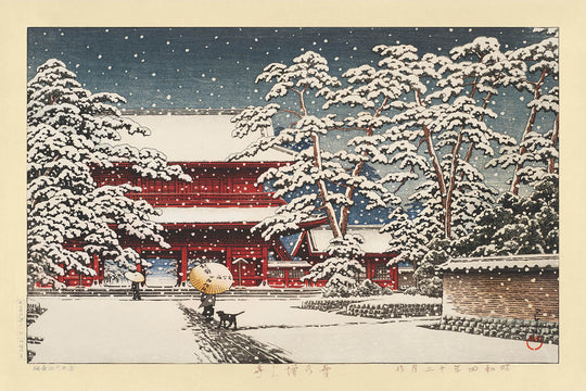 Dieses besondere Werk ist bemerkenswert für sein Zusammenspiel von strahlend weißem Schnee gegen die majestätischen, vermilionfarbenen Tempeltore, alles unterstrichen von dem ruhigen Blau des Schattens und der fallenden Dämmerung. Die stille Isolation der einsamen Figur mit einem Regenschirm in der Hand fügt narrative Tiefe und emotionale Resonanz hinzu, die über Generationen hinweg anspricht. Die zarte Abstufung des sanft fallenden Schnees evoziert das sanfte Schweigen des Winters und lädt den Betrachter ein, in seine ruhige Atmosphäre einzutreten.