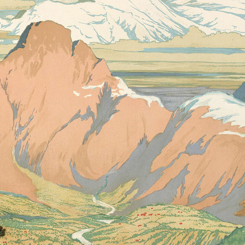 Norway – the Land of the Midnight Sun by Arent Lauritz Christensen captures the luminous drama of Norway’s fjords and summer skies during the golden age of European poster art. Rendered in an Art Nouveau spirit with flowing lines and elegant simplification, the scene sets cool blue water and deep green pines against warm, rosy mountain faces, evoking the unending glow of northern light. Bold, confident typography anchors the composition with NORWAY as a proud invitation to explore a landscape both rugged and sublime.