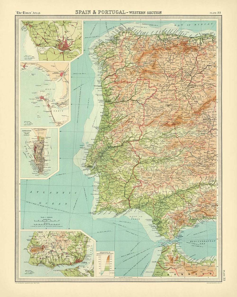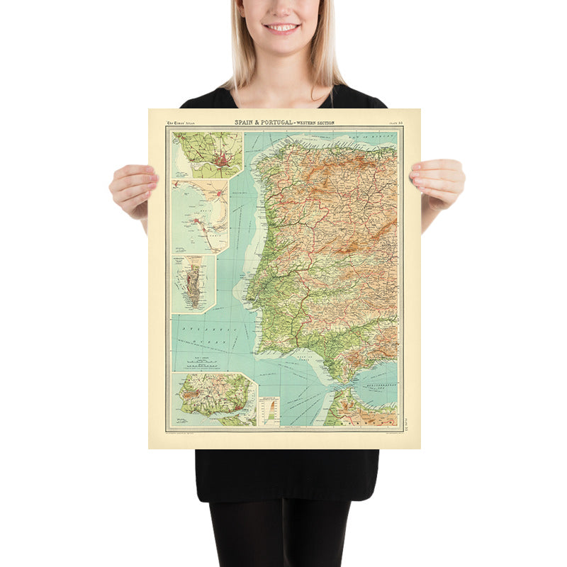 • Inset Maps: Detailed views of Porto, Cadiz, Gibraltar, and Lisboa