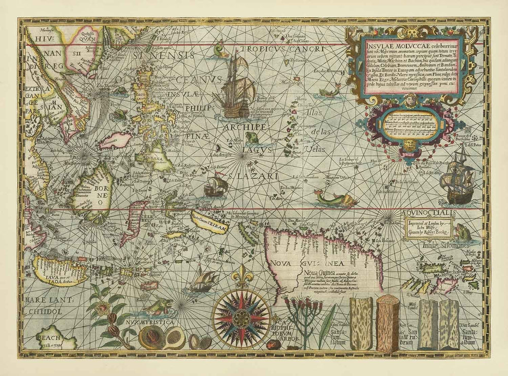 Die Standorte auf dieser Karte umfassen: Philippinen, Borneo, Kambodscha, Vietnam, Indonesien, Papua-Neuguinea und die Salomonen. Die Gewürzinseln sind natürlich ebenfalls auf der Karte dargestellt (jetzt bekannt als die indonesischen Maluku oder Molukken-Inseln).