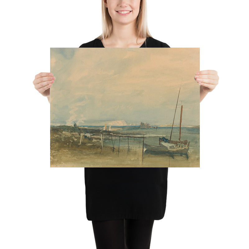 Coast Scene with White Cliffs (1800) by Joseph Mallord William Turner captures the restless beauty of Britain’s shoreline at the dawn of the 19th century. One of the leading figures of Romanticism, Turner channels atmosphere and emotion into a luminous seascape where pale cliffs rise over a tidal strand dotted with working boats. The scene likely evokes the chalk headlands of England’s south coast, distilled into shimmering light, shifting weather, and the human drama of life at the water’s edge. It’s an early glimpse of the mastery that would earn Turner the epithet “the painter of light.”