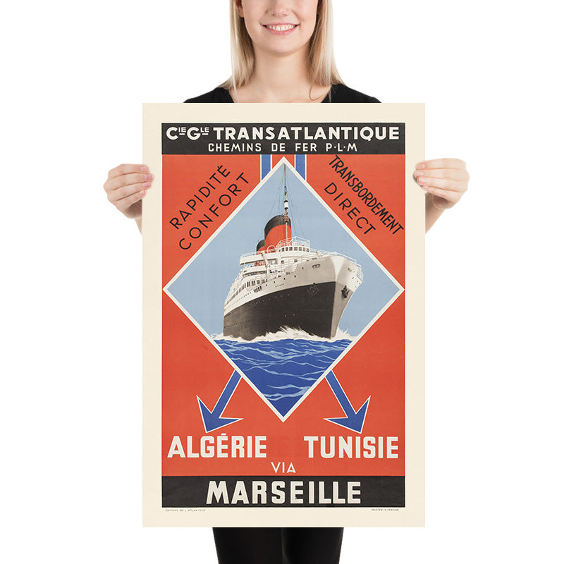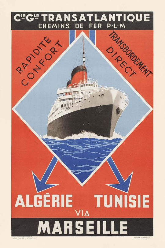 France Travel Poster: Rapidité Confort, Transbordement Direct by Compagnie Générale Transatlantique & Chemins de fer PLM, 1930