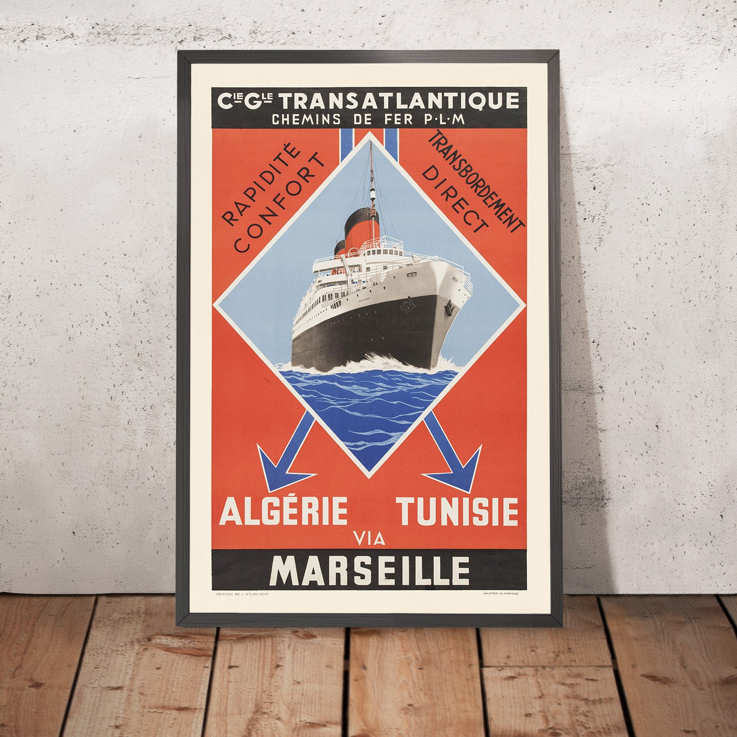 Design and color: the palette leans confidently into red, blue, and black—hallmark hues of the era—creating a striking contrast that reads beautifully across interiors. The clean lettering and balanced layout deliver that sought-after Art Deco poise, making the piece as at home in a minimalist living room as in a richly layered library or hallway. For lovers of French design, maritime history, or railway heritage, it’s a timeless statement—graphic, elegant, and evocative of journeys well begun.