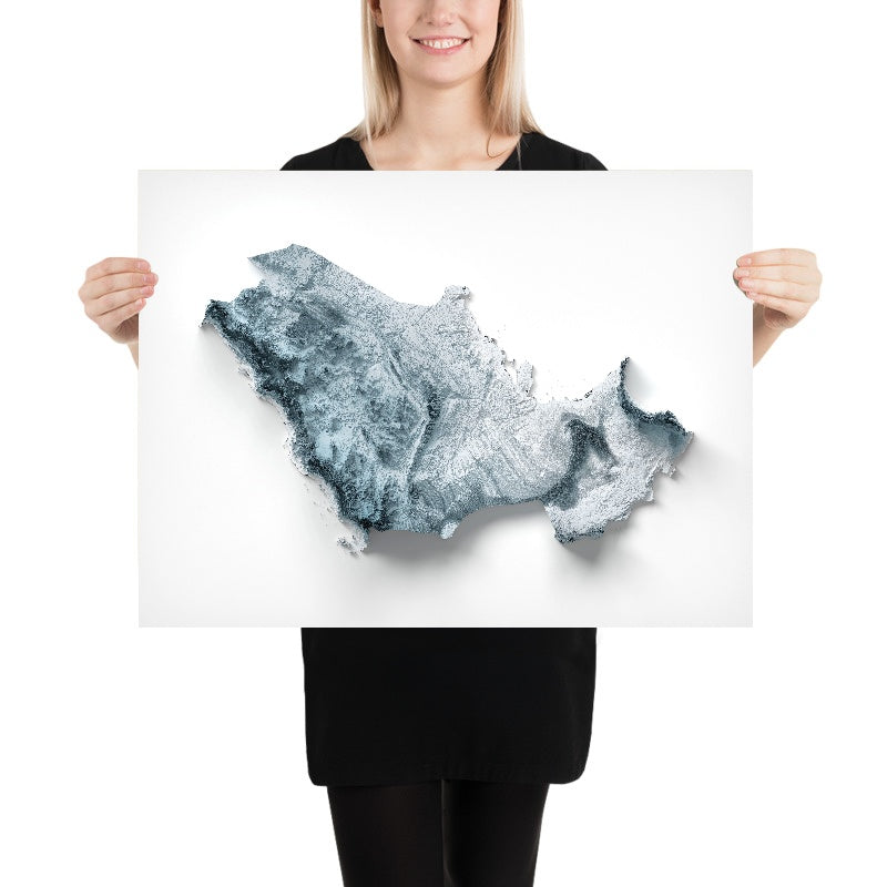 This is a minimalist topographical relief map of the Gulf countries, created by The Unique Maps Co. and enhanced with our trademarked Unique 3D process. There are no labels, no roads, and no towns — the landforms speak for themselves. Raking light and delicate shadow reveal the region’s sweeping deserts, serrated mountains, fossil plateaus, and coastal flats, letting you trace familiar horizons and rediscover the shapes that define life along the Gulf.