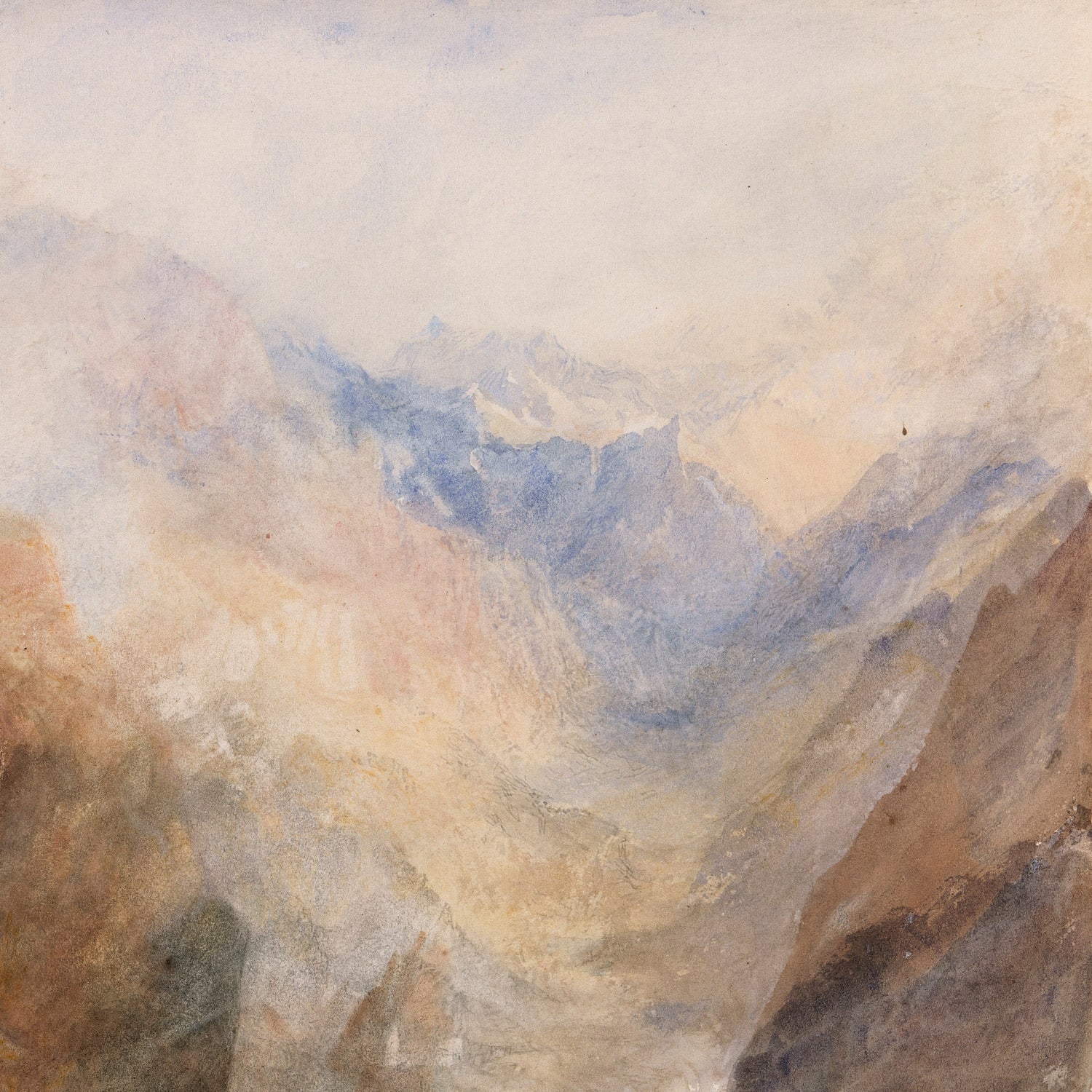 Turner—often called the “painter of light”—was one of Britain’s greatest Romantic artists. Celebrated for his radical handling of watercolor and oil, he transformed landscape into a vehicle for emotion and awe. By the 1830s his travels through the Alps honed a masterful grasp of atmosphere, transparency, and distance, influencing generations of landscape painters.