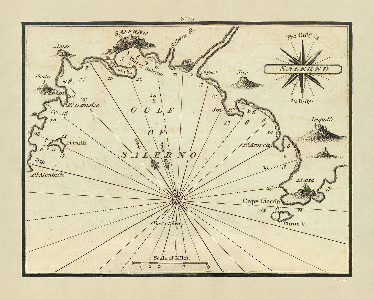 Die Karte des Golfs von Salerno ist nicht nur ein Navigationsinstrument, sondern auch ein Kunstwerk. Graviert von John Stephenson, einem bekannten Londoner Graveur, zeichnet sich die Karte durch ein Handwerksniveau aus, das sie von ihren französischen und italienischen Zeitgenossen abhebt, die oft grober ausgeführt waren. Die akribischen Gravuren umfassen Tiefenmessungen – Messungen der Wassertiefe, die für eine sichere Navigation entscheidend sind – und detaillierte Darstellungen der Küstenlinie, was sie zu einer unverzichtbaren Ressource für Seeleute der damaligen Zeit sowie zu einem faszinierenden Studienobjekt für moderne Sammler macht.
