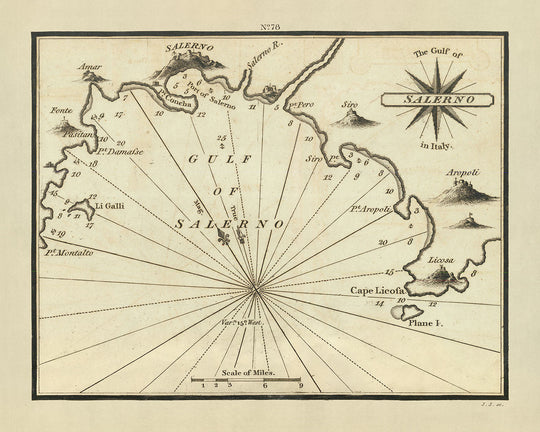 Diese Karte spiegelt mehr als nur geografische Informationen wider; sie ist ein Spiegel der historischen und kulturellen Dynamik der frühen 1800er Jahre. Der Golf von Salerno, der in der Region Kampanien in Italien liegt, ist reich an Geschichte und Legende, mit Städten wie Amalfi und Salerno sowie Sehenswürdigkeiten wie den antiken Ruinen von Pompeji. Durch die Einbeziehung dieser Elemente führte Heathers Karte nicht nur Seeleute durch diese Gewässer, sondern verband sie auch mit der geschichtsträchtigen Vergangenheit der Region, was den Reiz und den wissenschaftlichen Wert der Karte erhöht.