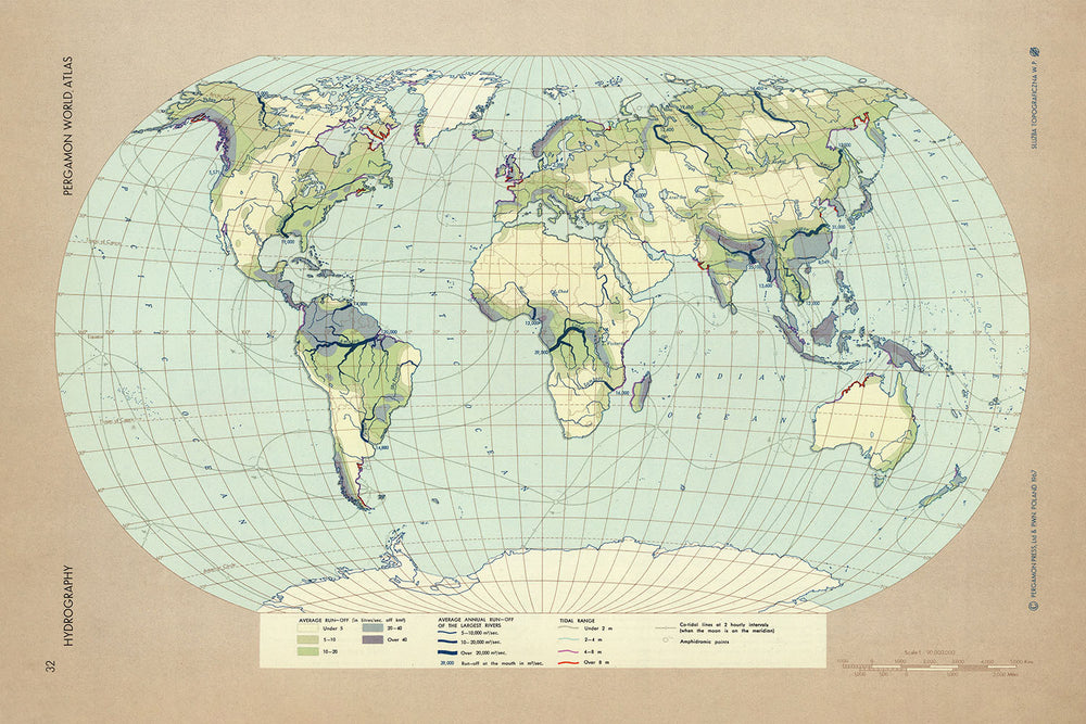 Diese Welt-Hydrographie-Karte von 1967, veröffentlicht vom polnischen Militärtopographiedienst, ist eine faszinierende und visuell beeindruckende Infografik, die eine Fülle von Daten über die Wasserressourcen der Welt präsentiert. Der Hauptfokus der Karte liegt auf der Hydrographie, einschließlich Abfluss, Flüssen und Gezeitenbereich weltweit.