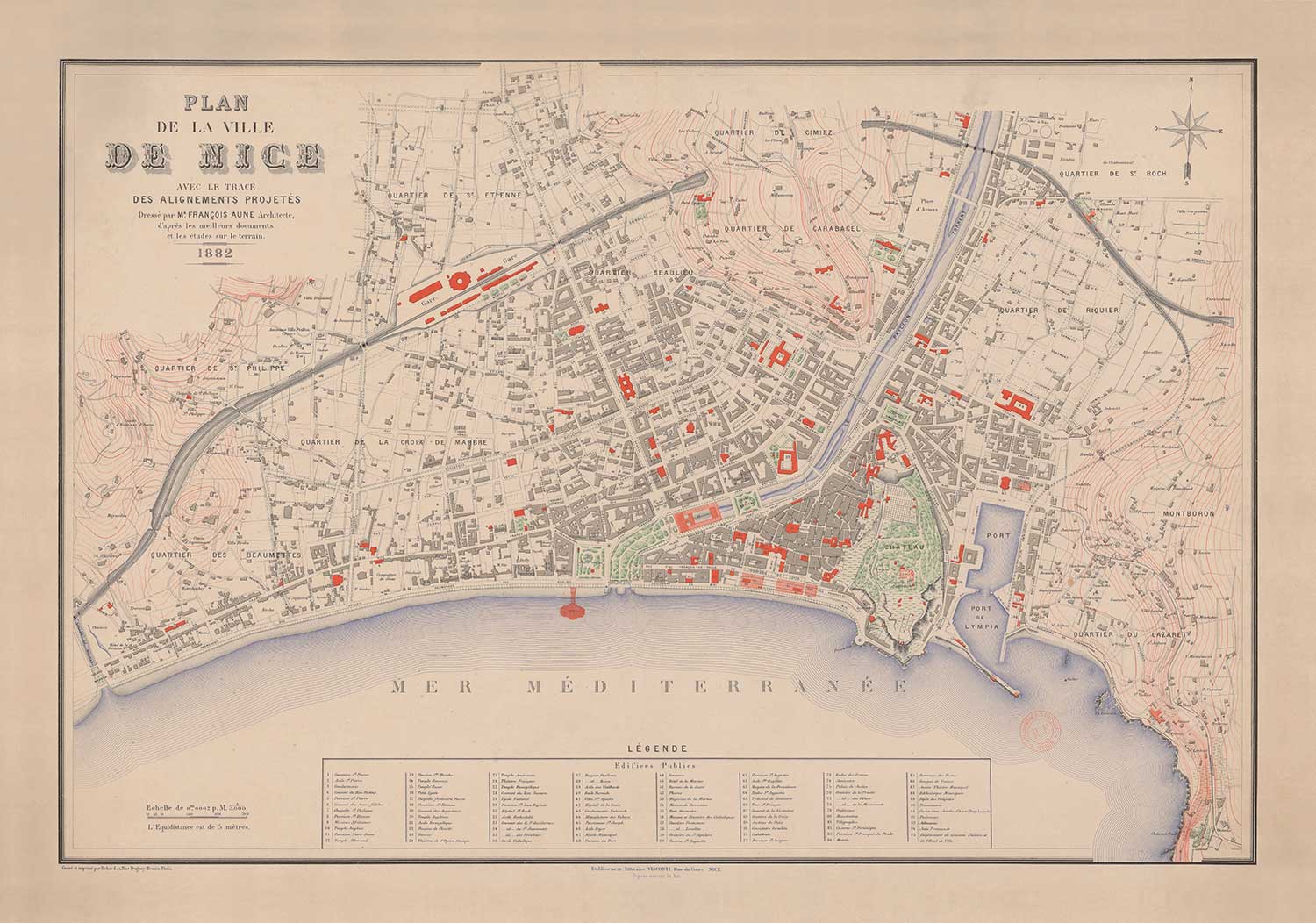 Diese wunderbare alte Karte von Nizza wurde ursprünglich 1882 veröffentlicht. Sie wurde von Francois Aune erstellt.