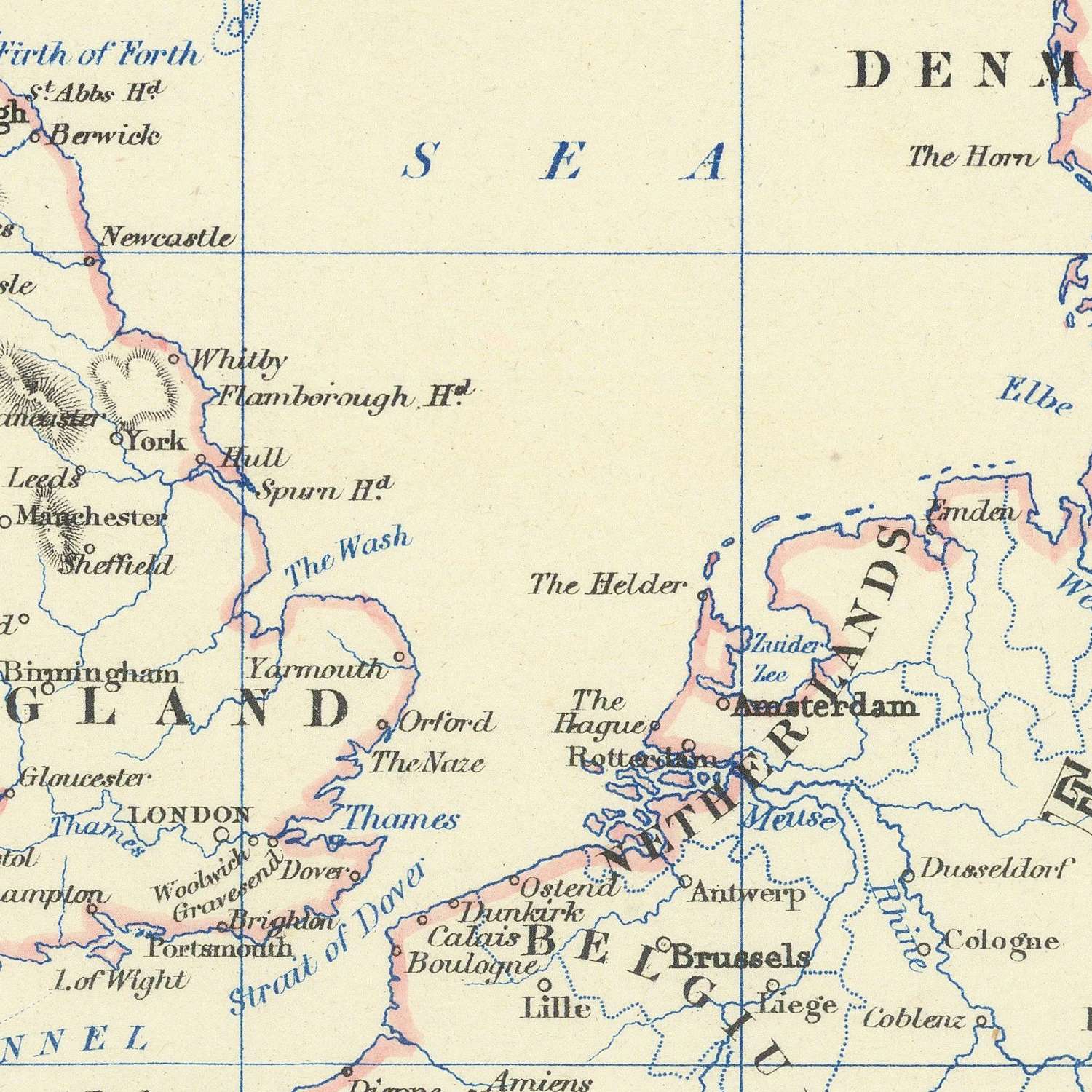 Basin of the North Atlantic, issued in 1861 by W. & A.K. Johnston, captures the oceanic heart of the nineteenth-century world with a scholar’s precision and an artist’s poise. The esteemed Johnston firm—renowned for elevating atlases into objects of enduring reference—organizes the vast theater between North America, Europe, and Northern Africa into a legible, luminous whole. Pastel washes gently differentiate lands and waters while preserving a wealth of fine detail, from coastal intricacies to the careful placement of cities and settlements. A distinctive Piano Key border frames the composition, underscoring the period’s taste for ornamented clarity and lending the chart a refined cadence that complements its deeply informative purpose.