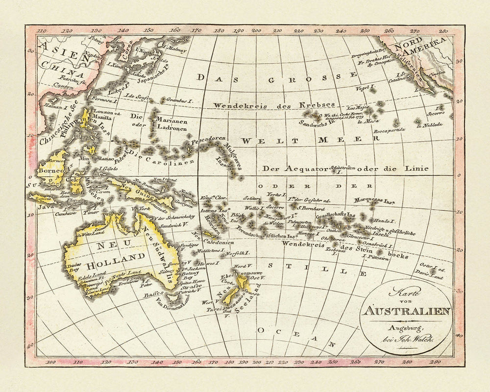Betreten Sie die faszinierende Welt der Erkundungen des frühen 19. Jahrhunderts mit Johann Walchs „Karte von Australien“, die 1817 in Augsburg veröffentlicht wurde. Diese außergewöhnliche Karte erfasst einen entscheidenden Moment im europäischen Verständnis des Südpazifiks und bietet einen auffälligen visuellen Bericht über Australien, Neuseeland, Hawaii und die verstreuten Inseln, die den weiten Ozean durchziehen. Walchs ursprünglicher deutscher Titel, elegant in einem dekorativen Kartuschen geschrieben, signalisiert sofort das historische Gewicht und die kontinentale Neugier, die diese Entdeckungsära prägten.