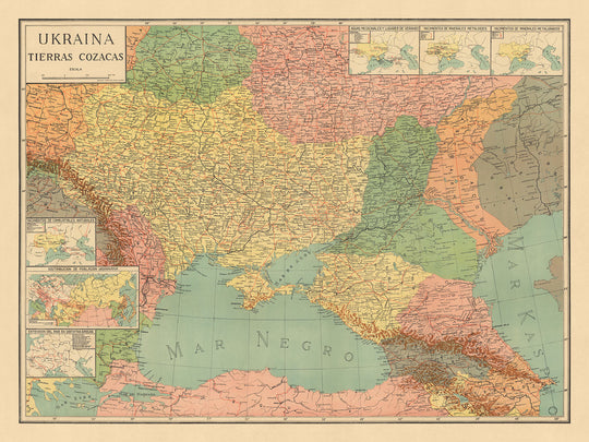 Natürliche Merkmale sind elegant dargestellt, wobei das Schwarze Meer und das Asowsche Meer einen auffälligen Hintergrund für die südlichen Regionen bieten. Die Reliefschattierung hebt die bergigen Terrains der Karpaten und des Kaukasus hervor und verleiht der Karte Tiefe und Dimension. Diese geografischen Merkmale definieren nicht nur die physische Landschaft, sondern spielen auch eine entscheidende Rolle in den historischen Erzählungen der Region. Die Aufmerksamkeit der Karte auf natürliche Ressourcen wie Brennstoffe und Mineralvorkommen unterstreicht die wirtschaftliche Bedeutung dieser Gebiete.