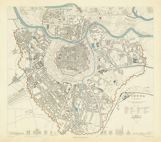 Tauchen Sie ein in den historischen Reiz Wiens mit dieser aufwendigen Darstellung von SDUK aus dem Jahr 1887. Diese antike Karte bietet einen detaillierten Einblick in die Vergangenheit und zeigt die berühmten Wahrzeichen und den komplizierten Grundriss der Stadt im späten 19. Jahrhundert. Es ist ein Zeugnis der sorgfältigen Handwerkskunst der damaligen Zeit und des anhaltenden Charmes Wiens und macht es zu einem Muss für Geschichtsinteressierte, Kartensammler und Bewunderer der österreichischen Hauptstadt.
