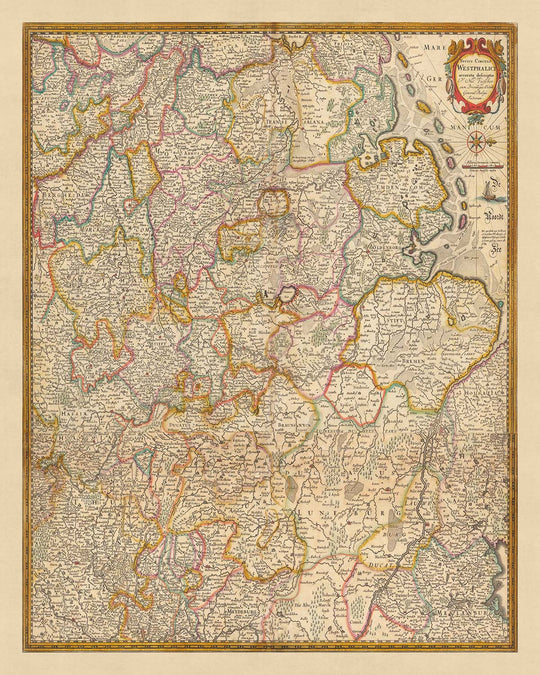 Die Karte hebt mehrere wichtige Städte und Sehenswürdigkeiten hervor, darunter Hamburg, Bremen, Hannover, Köln und Dortmund. Jede Stadt wird bis ins kleinste Detail dargestellt und bietet einen Überblick über ihre historische Bedeutung und ihren geografischen Kontext. Die Darstellung dieser Städte ermöglicht nicht nur einen Einblick in ihre Vergangenheit, sondern auch ein tieferes Verständnis ihrer Rolle im größeren westfälischen Raum.