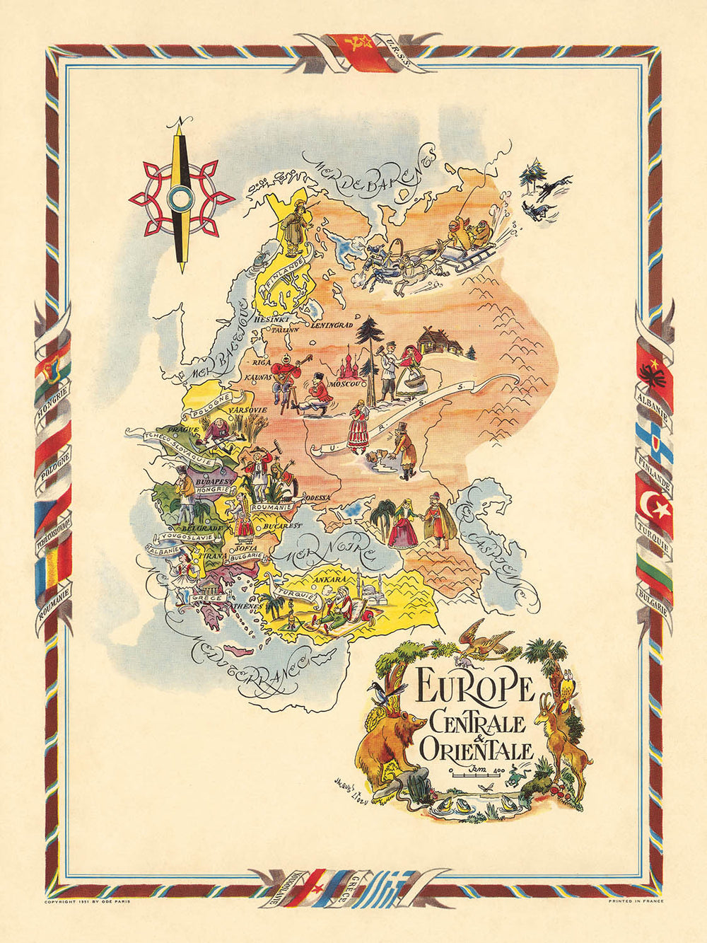 "Zentrale und Osteuropa," geschaffen von dem renommierten Jacques Liozu im Jahr 1951, ist eine atemberaubende bildliche Karte, die das Wesen von Mittel- und Osteuropa während einer entscheidenden Ära einfängt. Liozu, gefeiert für seine thematische und bildliche Kartografie, verleiht dieser Karte mit aufwendigen Details, die den kulturellen, industriellen und landwirtschaftlichen Reichtum der Region widerspiegeln. Die Karte ist ein lebendiger Wandteppich von Nationen, die jeweils mit Symbolen ihrer einzigartigen Beiträge zur Wirtschaft und zum Erbe des Kontinents illustriert sind. Diese Karte ist nicht nur eine geografische Darstellung, sondern eine visuelle Erzählung des Europas nach dem Zweiten Weltkrieg, einer Zeit, die von Wiederaufbau und Transformation geprägt war.
