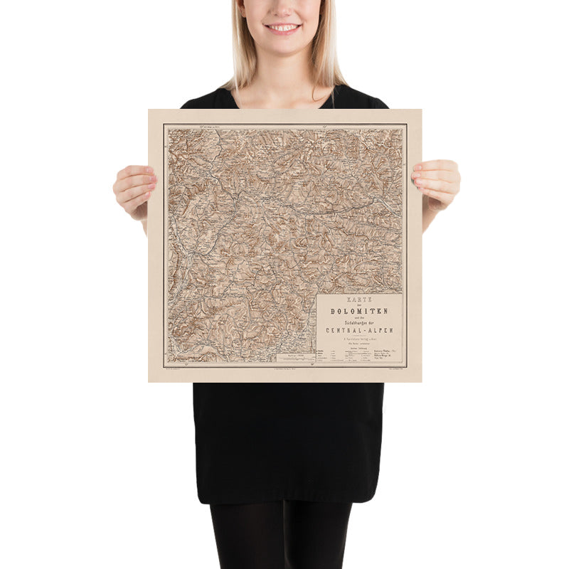 Alois Hartleben’s 1880 Karte der Dolomiten und des Südabhanges der Central-Alpen captures the vertical drama of the Dolomites and the southern ramparts of the Central Alps with uncommon clarity. The composition spans from Bozen on the western edge to Tolmezzo in the east, with Feltre at the southern threshold and the Großes Wiesbachhorn anchoring the north—an elegant frame for a landscape in motion. Finely stepped elevation contours combine with expressive shaded relief to articulate serrated ridgelines, amphitheater-like cirques, and the decisive corridors of valleys and passes. Major ranges, key saddles, and landmark summits are crisply labeled, while a lattice of trails and routes threads together market towns, spa resorts, and alpine hamlets, revealing how movement, commerce, and culture negotiated this demanding terrain.