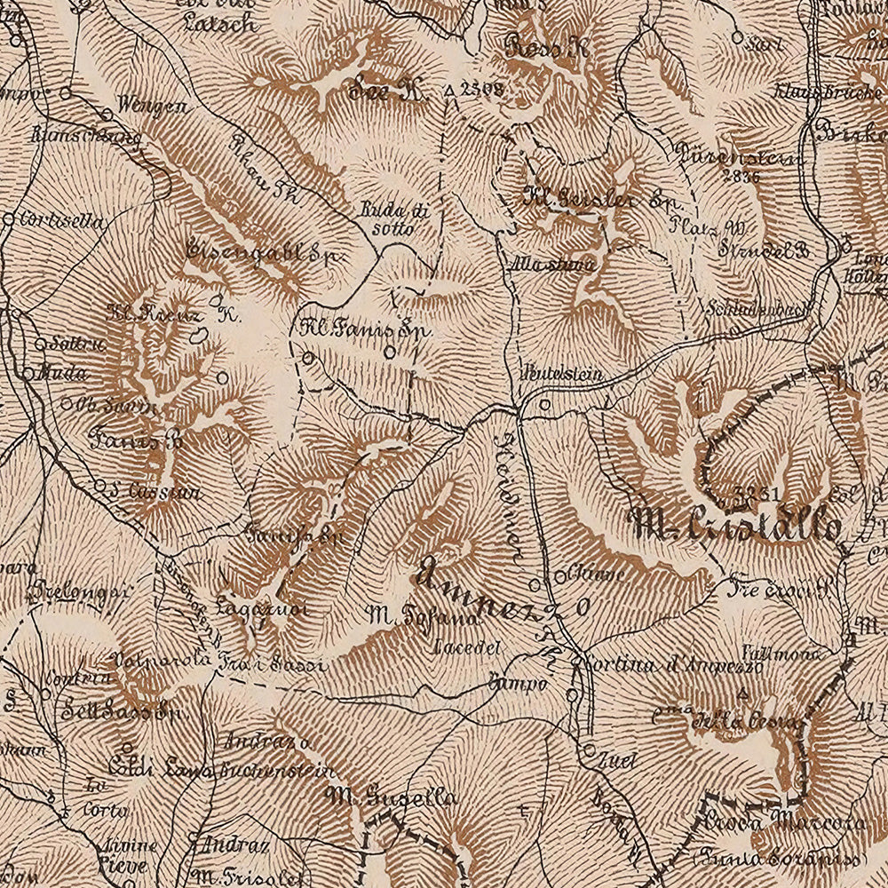 Issued at the height of nineteenth-century exploration and scientific surveying, the map distills a moment when the Alps were becoming both a laboratory and a playground. Climbers and naturalists pushed deeper into the limestone fastness of the Dolomites, while the rise of organized alpinism and guide culture drew visitors to Cortina d’Ampezzo (then within Tyrol), Val di Fassa, and Seis am Schlern. Spa destinations such as Meran flourished, and new corridors—the Brenner axis to Bozen and the Puster valley toward Bruneck, Innichen, and Lienz—accelerated travel. Hartleben’s meticulous topography, with its legible gradients and carefully plotted routes, speaks directly to this era of measured curiosity, when accurate relief was both a scientific achievement and a practical necessity for tourism.