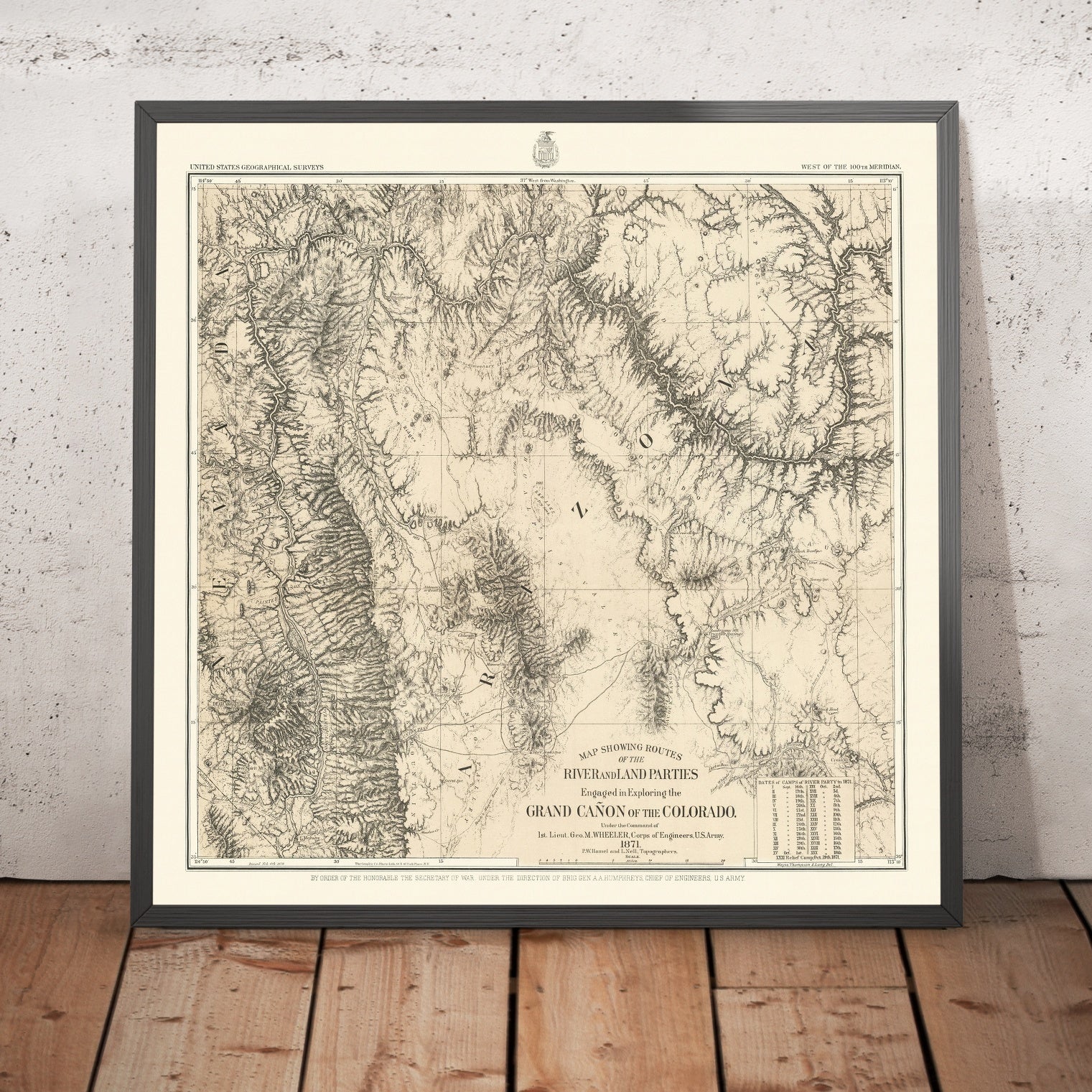 As an instrument of statecraft and science, Wheeler’s mapping helped seed later achievements in topographic cartography, resource surveys, and environmental planning, including the reclamation era and the eventual protection of the Grand Canyon. The disciplined contours, keyed symbols for routes and camps, and careful boundary delineations demonstrate a method that fused field observation with emerging geodetic standards. Yet beyond its technical mastery, the map preserves the narrative of audacious exploration—boats bucking rapids, land parties edging across mesas, scouts reading cloud shadows for hidden water. It is a rare convergence of art and empiricism, illuminating a defining chapter in the making—and imagining—of the American West.