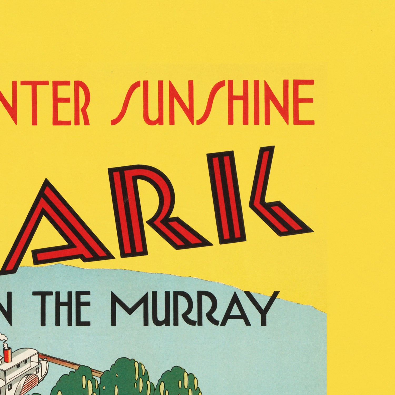 For Glorious Winter Sunshine come to Renmark on the Murray is a classic Australian travel poster celebrating the river town of Renmark in South Australia. The artist is unknown, but the work bears the hallmarks of the Government Tourist Bureaux in Adelaide and Melbourne, who commissioned bold, uplifting lithographs to entice travellers to the Riverland. The headline is emblazoned in big, confident capitals across the top, and the scene is bathed in sunlit hues—an instant promise of warmth on the Murray.