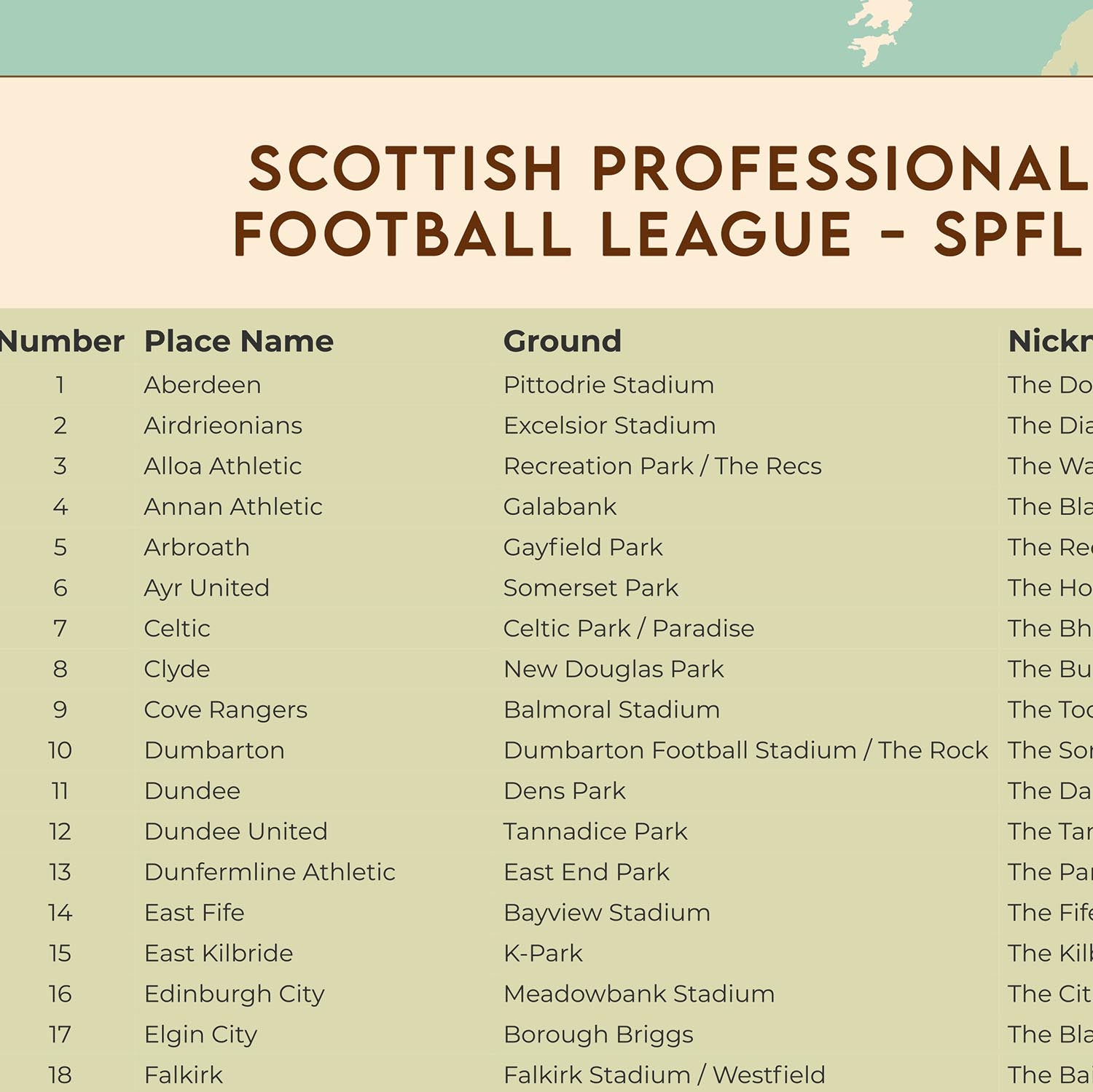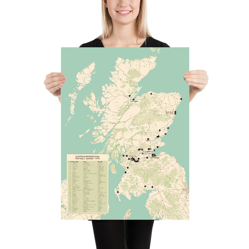 Diese moderne Schottland-Karte von The Unique Maps Co. zeigt alle 42 Vereine der Scottish Professional Football League (SPFL) in einem klaren, wandwürdigen Design — eine perfekte Momentaufnahme der wahren Geografie des schottischen Fußballs, von den dicht gedrängten Rivalitäten im Central Belt bis hin zu langen Fahrten in die Highlands und hinaus zu den Küsten.