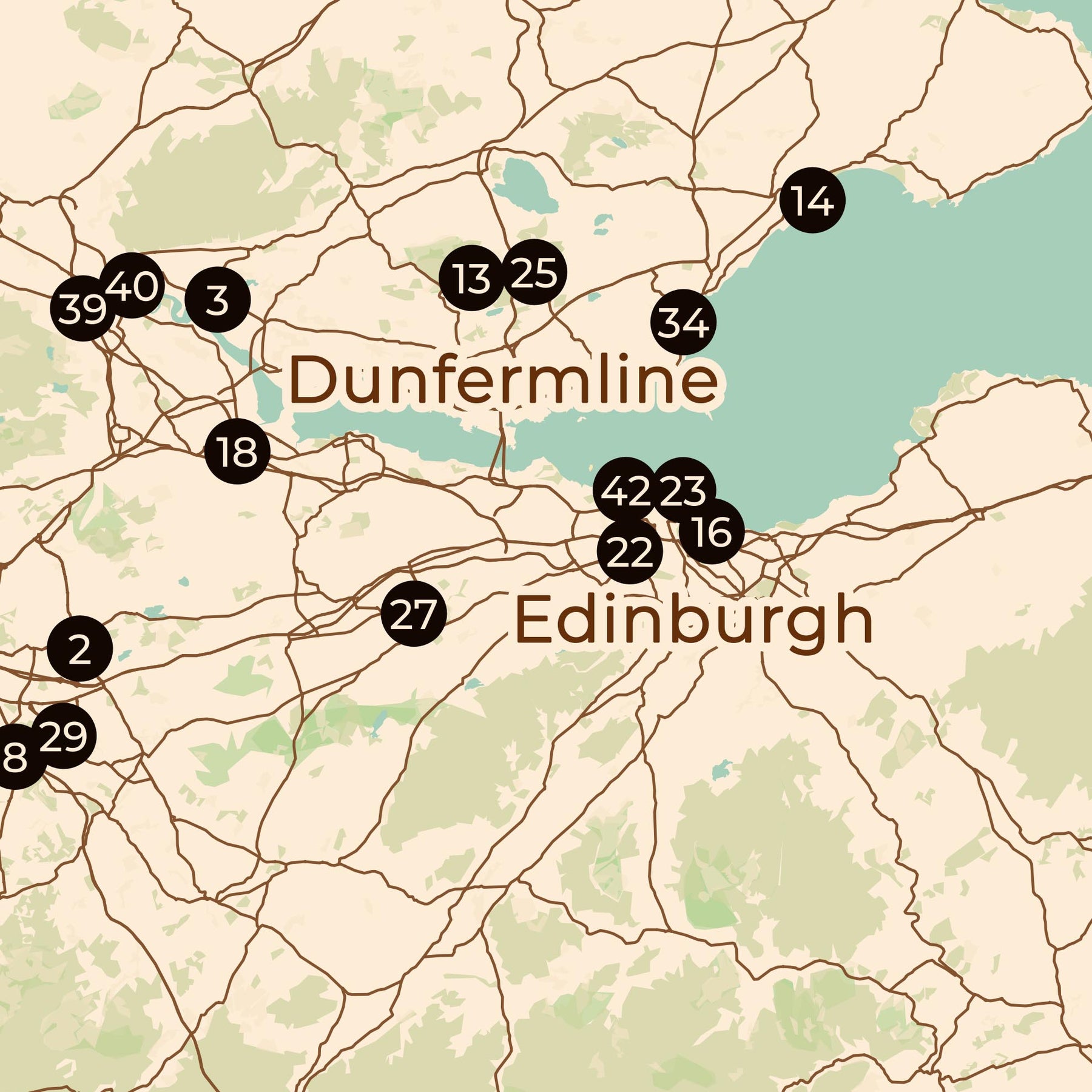 Vor dem Hintergrund einer zeitgenössischen Karte von Schottland ist jeder Vereinsstandort mit einem nummerierten Punkt markiert, was die Erkundung sofort besonders reizvoll macht. Man erkennt auf einen Blick die Struktur der Auswärtsfahrten, die Logik lokaler Derbys und die Art und Weise, wie sich Fußballgemeinschaften um Orte, Städte und Verkehrskorridore gruppieren.