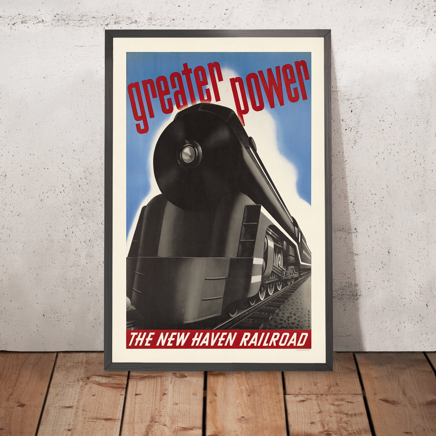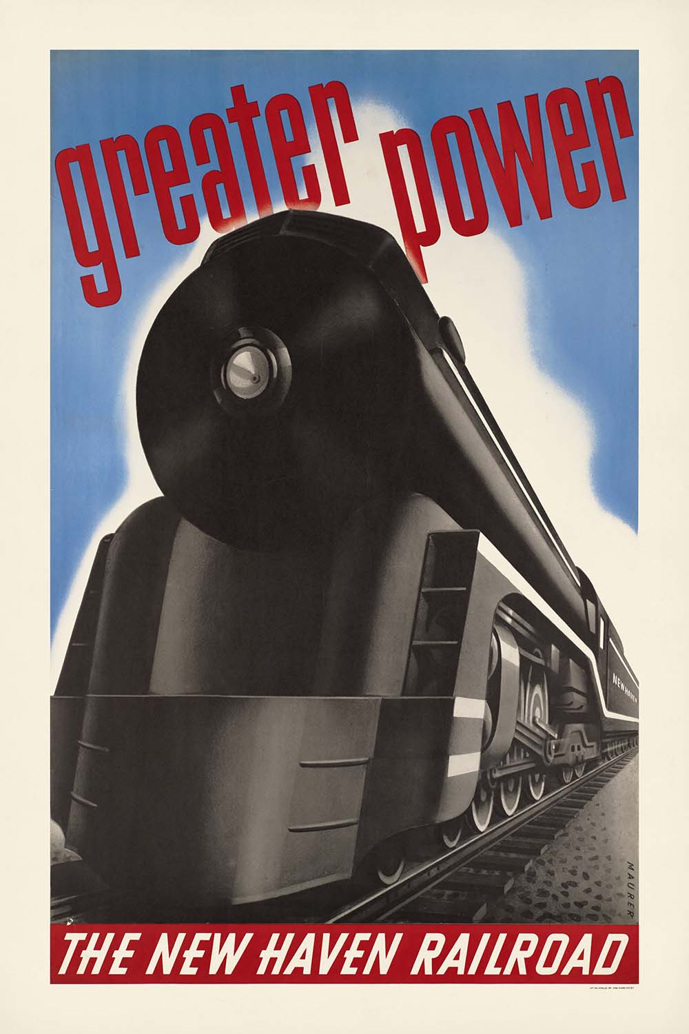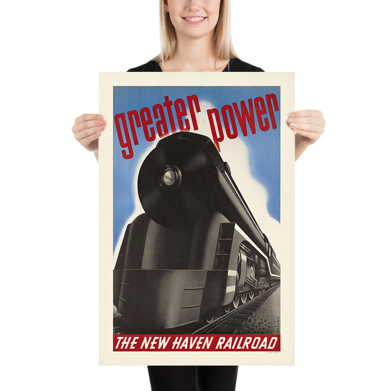 Greater power by Sascha Maurer is a classic Art Deco travel poster that captures the machine‑age optimism of early 20th‑century America. With a streamlined locomotive charging across a blue sky, its bold geometry and dramatic contrasts celebrate the era’s belief in technology, speed, and progress. The composition—clean, modern, and immediately legible—was designed to catch the eye from a distance, inviting travelers to imagine faster, more powerful journeys between America’s great cities.