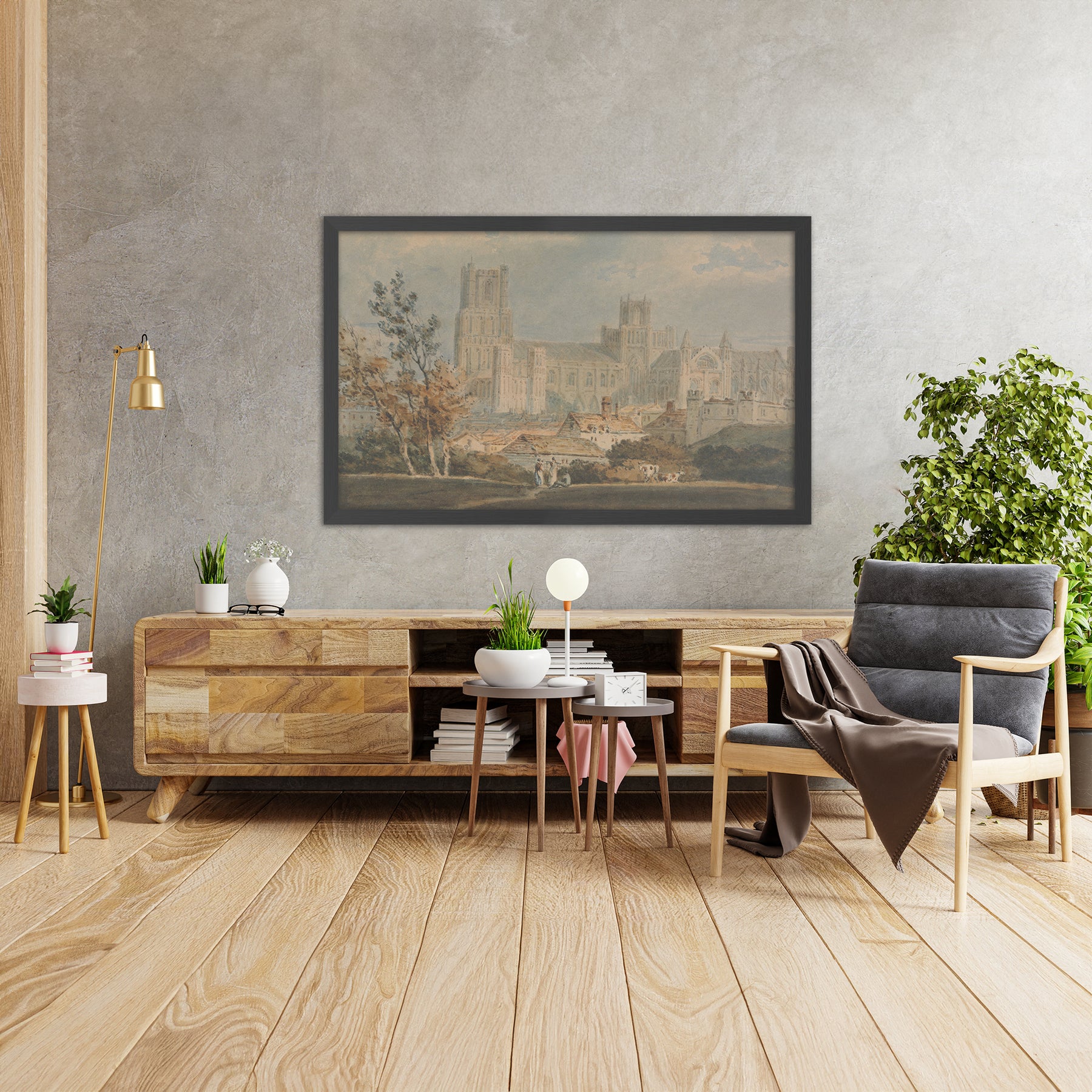 Color and craft heighten the mood. A honeyed, orange light suffuses stone and earth, set against pale blue sky and fresh greens in the fields and foliage. Turner’s light, fluid brushwork softens distances and edges, producing a gauzy depth that feels both precise and dreamlike. Organic forms—trees, hedgerows, low roofs—play in counterpoint to the cathedral’s firm geometry, creating a balanced composition that suits classical interiors as well as contemporary rooms seeking warmth and historical character. It’s an ideal choice for admirers of architecture, British landscapes, and the lyrical power of Romantic painting.