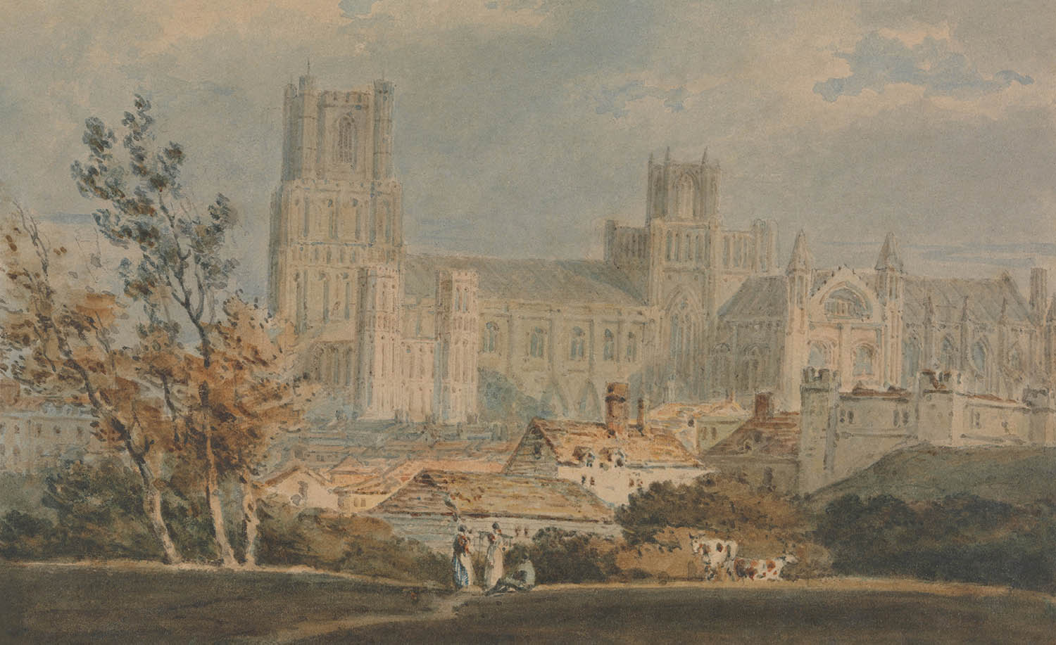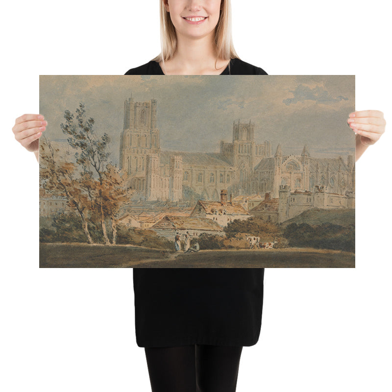 The subject itself—Ely Cathedral—is a touchstone of English heritage, its medieval fabric long celebrated for both scale and intricacy. Turner’s portrayal reflects the Romantic ideal: a storied structure embraced by nature, with small human presences and rural buildings providing a gentle narrative of everyday life. In an age increasingly shaped by industrial progress, this image preserves a slower rhythm and a close bond between community, land, and monument.