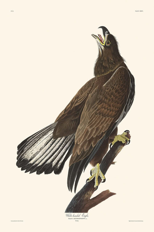 John James Audubons Weißkopfadler (Tafel 126), veröffentlicht 1827, ist eine exquisite Vogelillustration aus seiner legendären Birds of America-Reihe. Dieses atemberaubende Kunstwerk fängt die Erhabenheit des Weißkopfadlers genau ein, ein Symbol, das für seine Stärke, Freiheit und nationale Bedeutung verehrt wird.