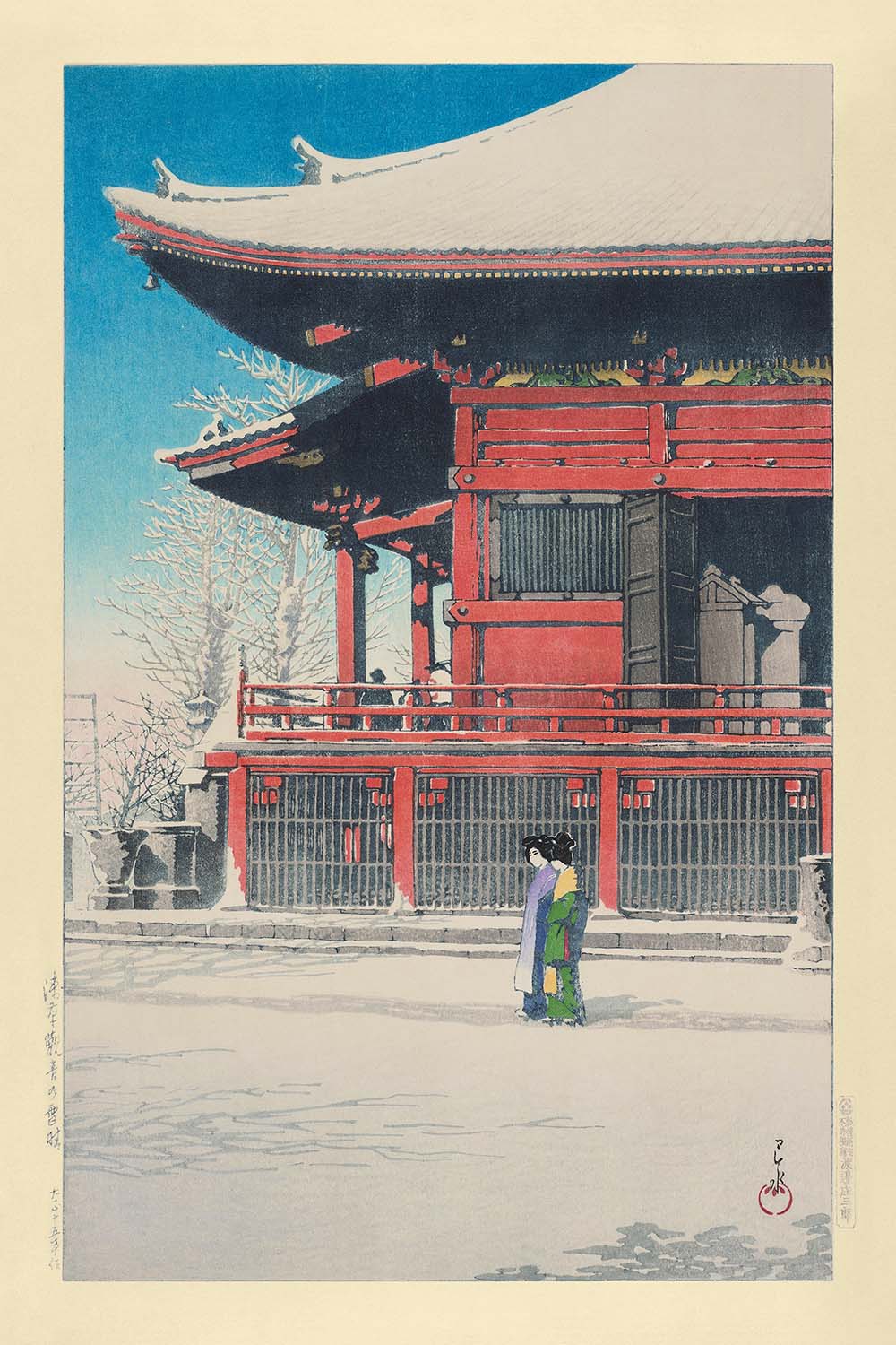El Templo Kannon de Asakusa después de la nieve, Tokio, de Hasui Kawase, es un ejemplo cautivador del trabajo del renombrado grabador japonés, creado en 1935. Esta obra de arte ilustra el icónico Templo Kannon de Asakusa, bellamente cubierto de nieve, mostrando la serena belleza de la arquitectura tradicional japonesa. Hasui Kawase fue una figura clave en el movimiento Shin-Hanga, que buscaba dar nueva vida a la tradición ukiyo-e mientras incorporaba el realismo occidental y la atención a la luz.