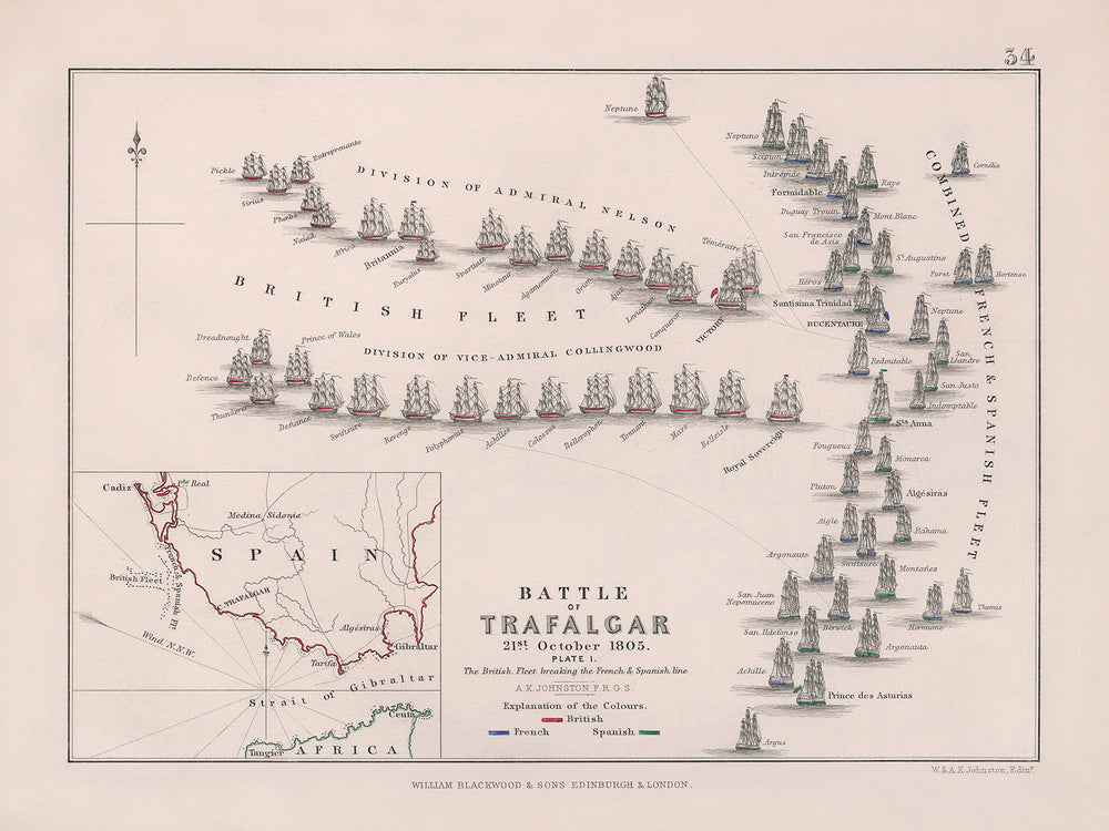 La "Batalla de Trafalgar: La flota británica rompiendo la línea francesa y española" es particularmente notable por su vívida representación de la histórica batalla naval entre el almirante Nelson y las flotas de Napoleón Bonaparte. El uso del color por parte de Johnston da vida a la escena, con las tropas británicas marcadas en rojo, las francesas en azul y las españolas en verde. El cuidadosamente grabado mapa in situ de parte de España y el Estrecho de Gibraltar realza el contexto geográfico de la batalla, convirtiéndolo en una pieza visual y educativa intrigante.