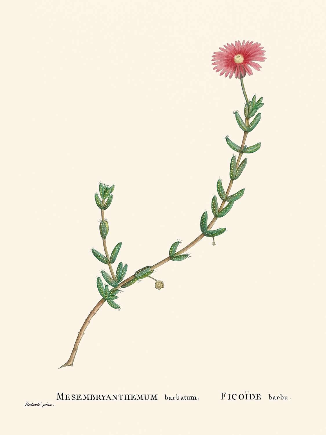 La obra de Pierre-Joseph Redouté es famosa por su exquisito detalle y su delicado uso del color. Esta ilustración de "Mesembryanthemum Barbatum" captura la belleza única de la flor de caléndula, también conocida botánicamente como Mesembryanthemum Barbatum. Los tonos suaves y el diseño intrincado transmiten una sensación de gracia natural, lo que la convierte no solo en una encantadora obra de arte, sino también en una mirada educativa a las maravillas botánicas del pasado. La singularidad de esta obra radica en su contexto histórico y en la capacidad de Redouté para combinar la precisión científica con el estilo artístico, asegurando su legado como maestro de la ilustración floral.