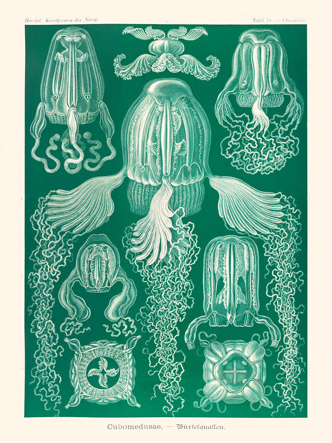 La ilustración de la medusa caja "Cubomedusae Würfelquallen (Tafel 78)" de Ernst Haeckel, publicada por primera vez en 1904, es una representación visual fascinante de la vida marina. Como parte del trabajo integral de Haeckel "Kunstformen der Natur", esta ilustración captura la belleza intrincada y delicada de las especies de medusas, meticulosamente detalladas tanto en forma como en textura.