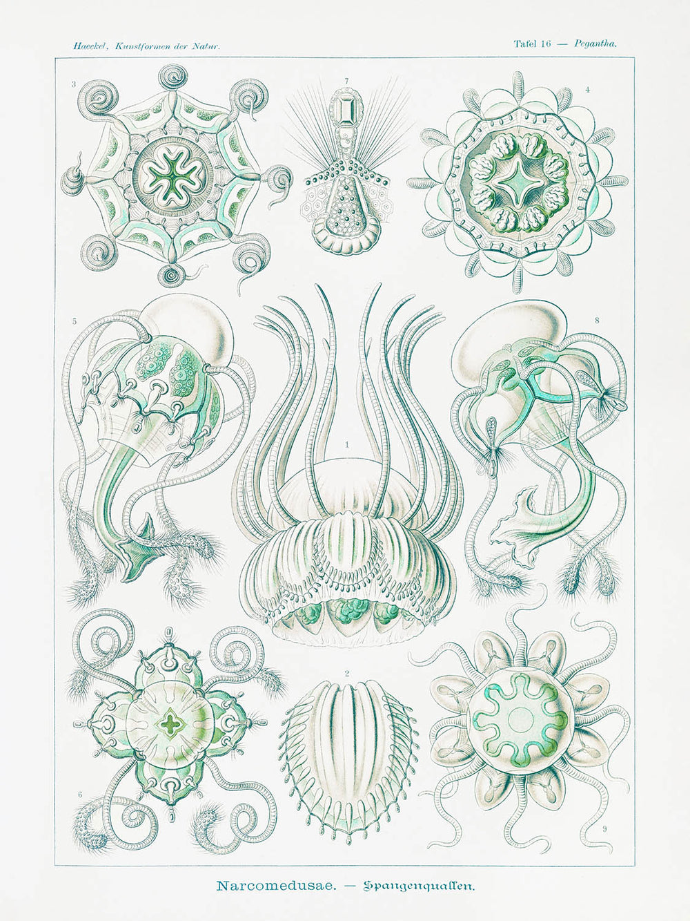Narcomedusae Spangenquallen (Tafel 16) es una ilustración científica fascinante de Ernst Haeckel, publicada originalmente en 1904 como parte de su ilustre "Kunstformen der Natur". Esta obra en particular muestra varias especies de medusas con un detalle intrincado, reflejando la profunda admiración de Haeckel por el mundo natural.