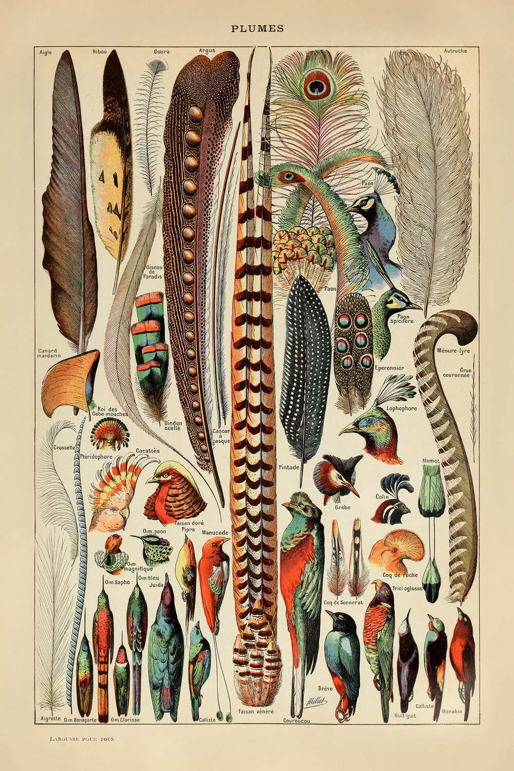 "Plumes" is particularly notable for its impressive zoological accuracy, displaying an array of feathers from diverse bird species, each carefully labeled in elegant French script. The species depicted in this illustration include: