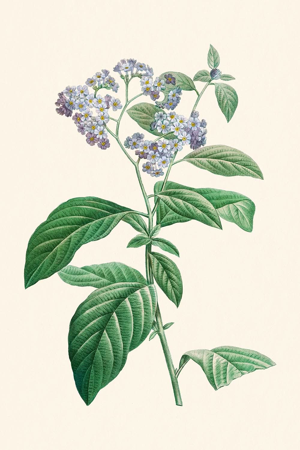 Descubra la exquisita belleza de "No me olvides" (Myosotis spp.), una cautivadora ilustración botánica victoriana del reconocido artista Pierre-Joseph Redouté, publicada por primera vez en 1802. Redouté, aclamado como uno de los más grandes ilustradores botánicos, dedicó gran parte de su ilustre carrera a pintar la flora del castillo de Malmaison por orden de Josefina Bonaparte, la esposa del general Napoleón. Esta obra maestra forma parte de su monumental serie "Les Liliacées".